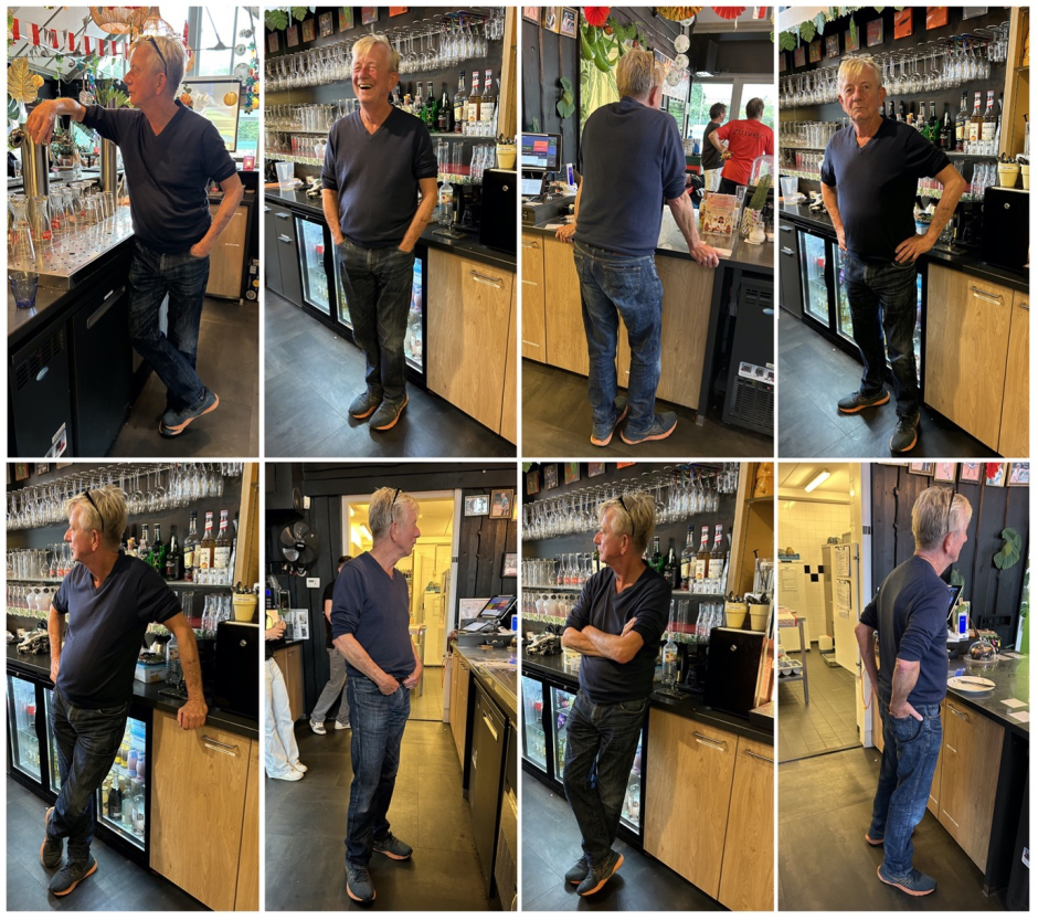 Toch waren er ook momenten dat er even niets te doen was. En dan duikt er een probleem op dat iedereen die in de horeca werkt kent: waar laat ik mijn handen? Dat vergt weer andere kwaliteiten dan overal werk zien. Je moet je handen zo houden dat je niet uitstraalt of je wel wat anders te doen hebt dan een bestelling aannemen. Je moet toeschietelijk overkomen, bedrijvig, doortastend. Ik geef het je te doen. Zelfs de man die overal werk ziet, wist soms niet waar hij ze moest laten.